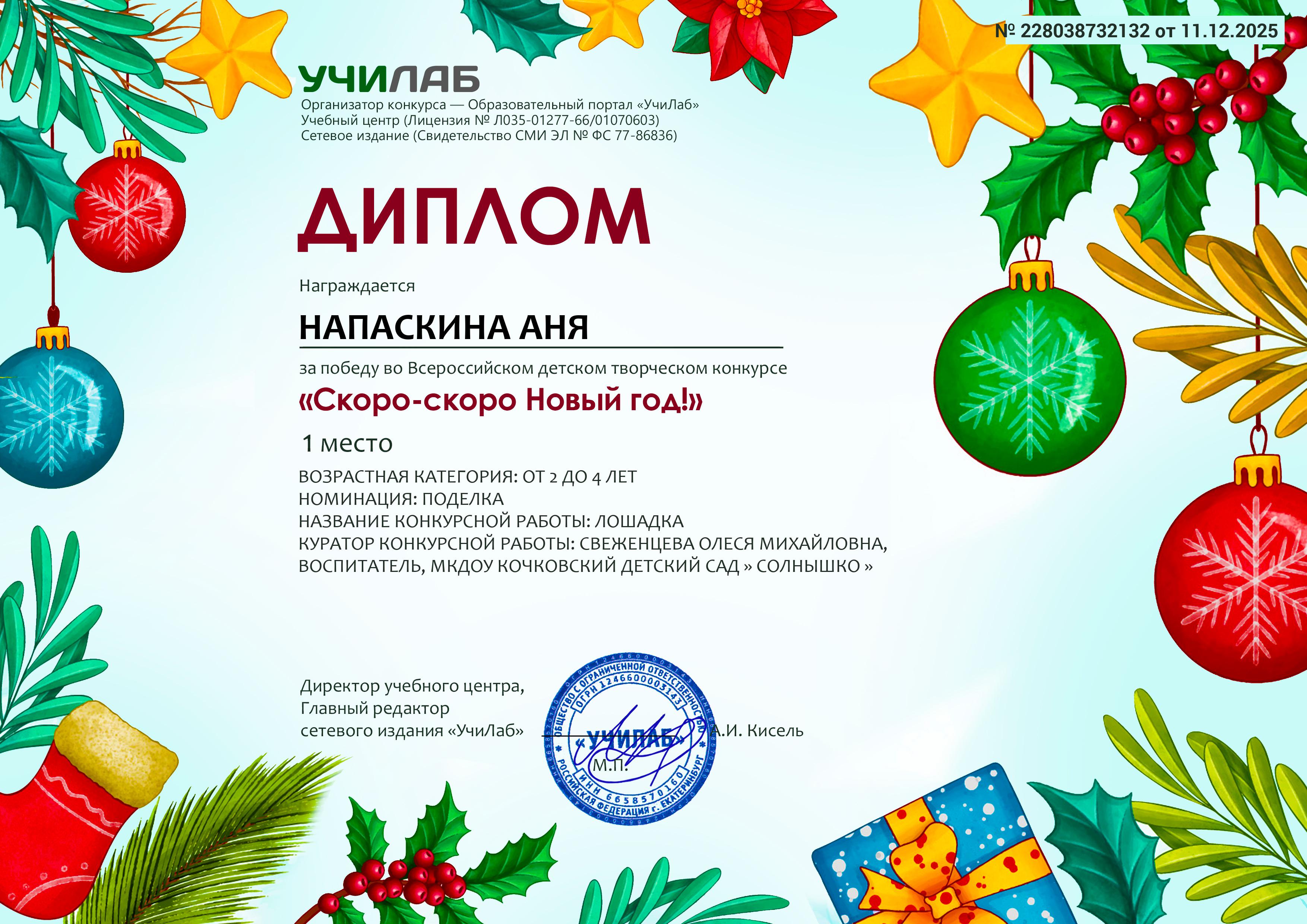 Всероссийский детский творческий конкурс "Скоро, скоро Новый год" Напаскина Аня