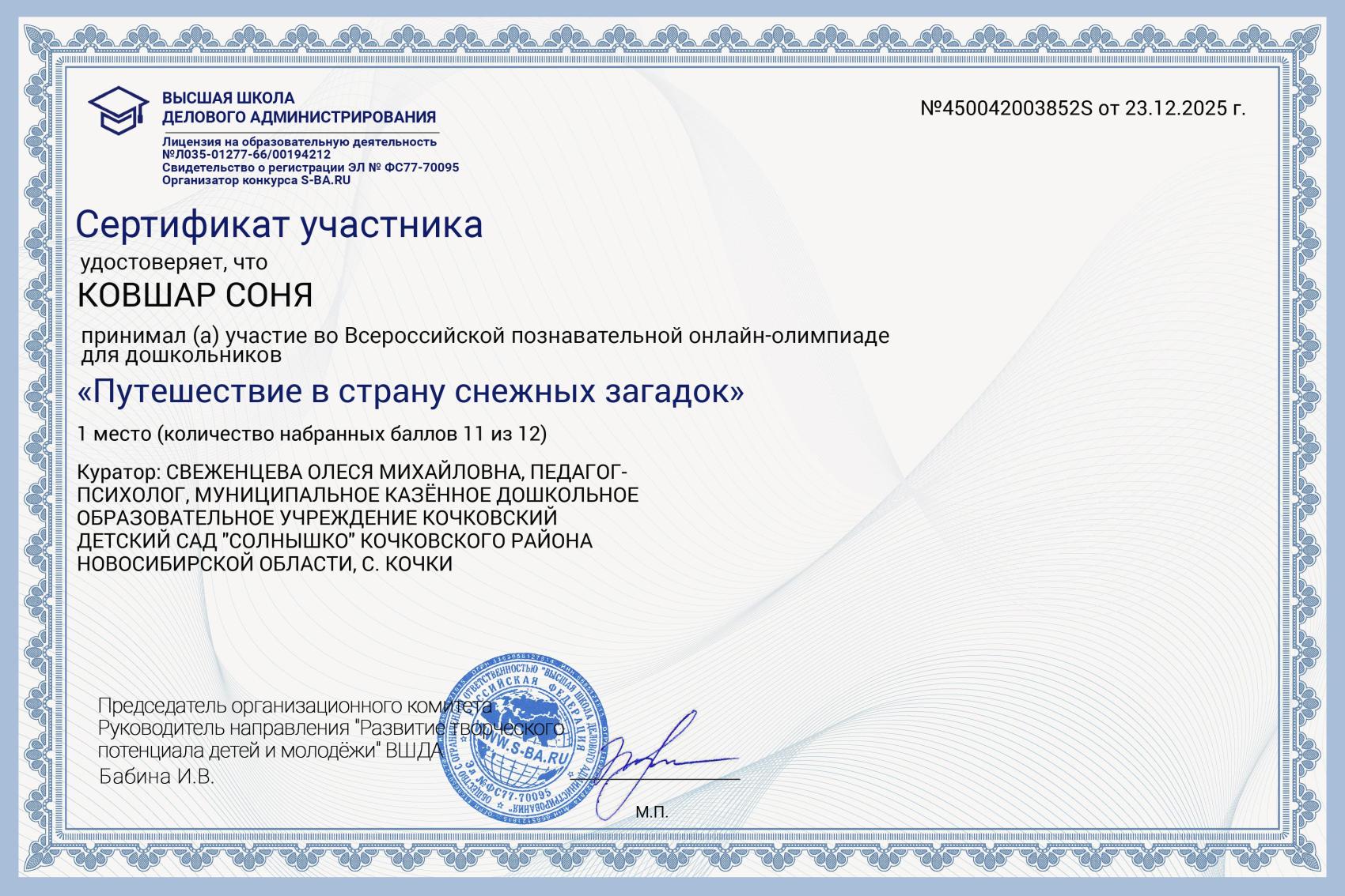 Всероссийская онлайн-олимпиада "Путешествие в страну снежных загадок" Ковшар Соня