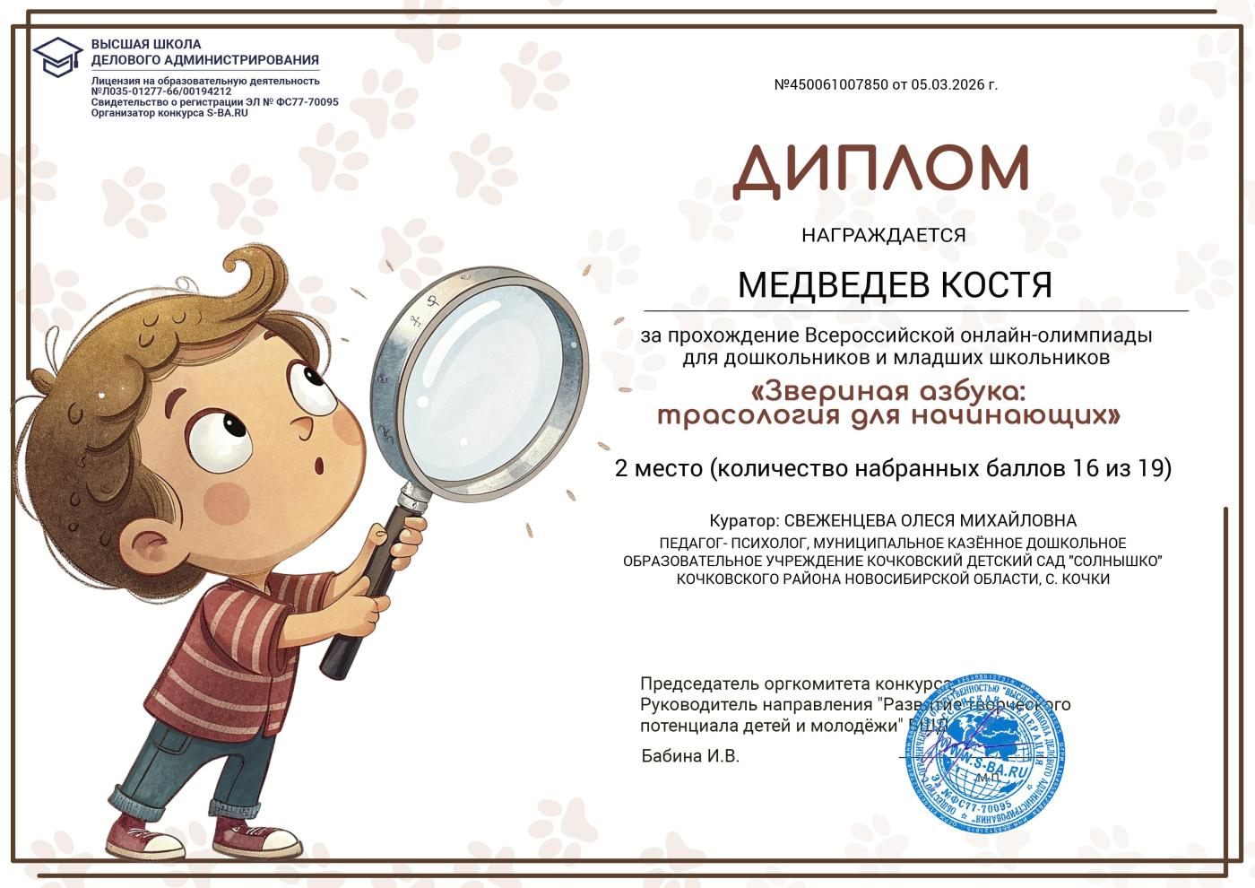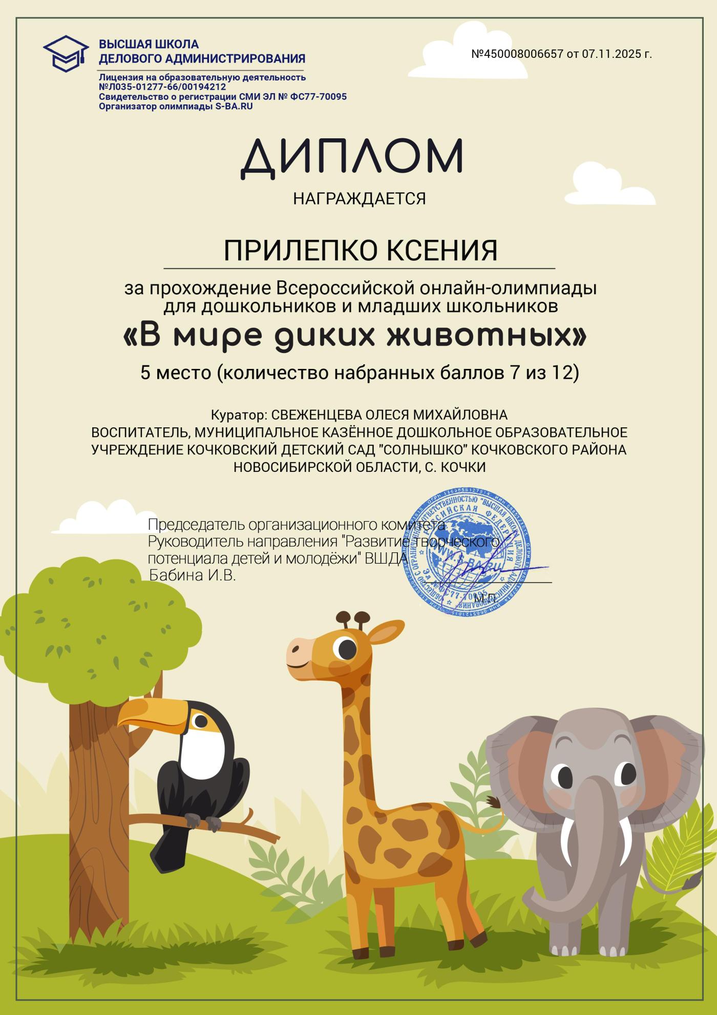 Всероссийская онлайн-олимпиада для дошкольников " В мире диких животных" Прилепко Ксения