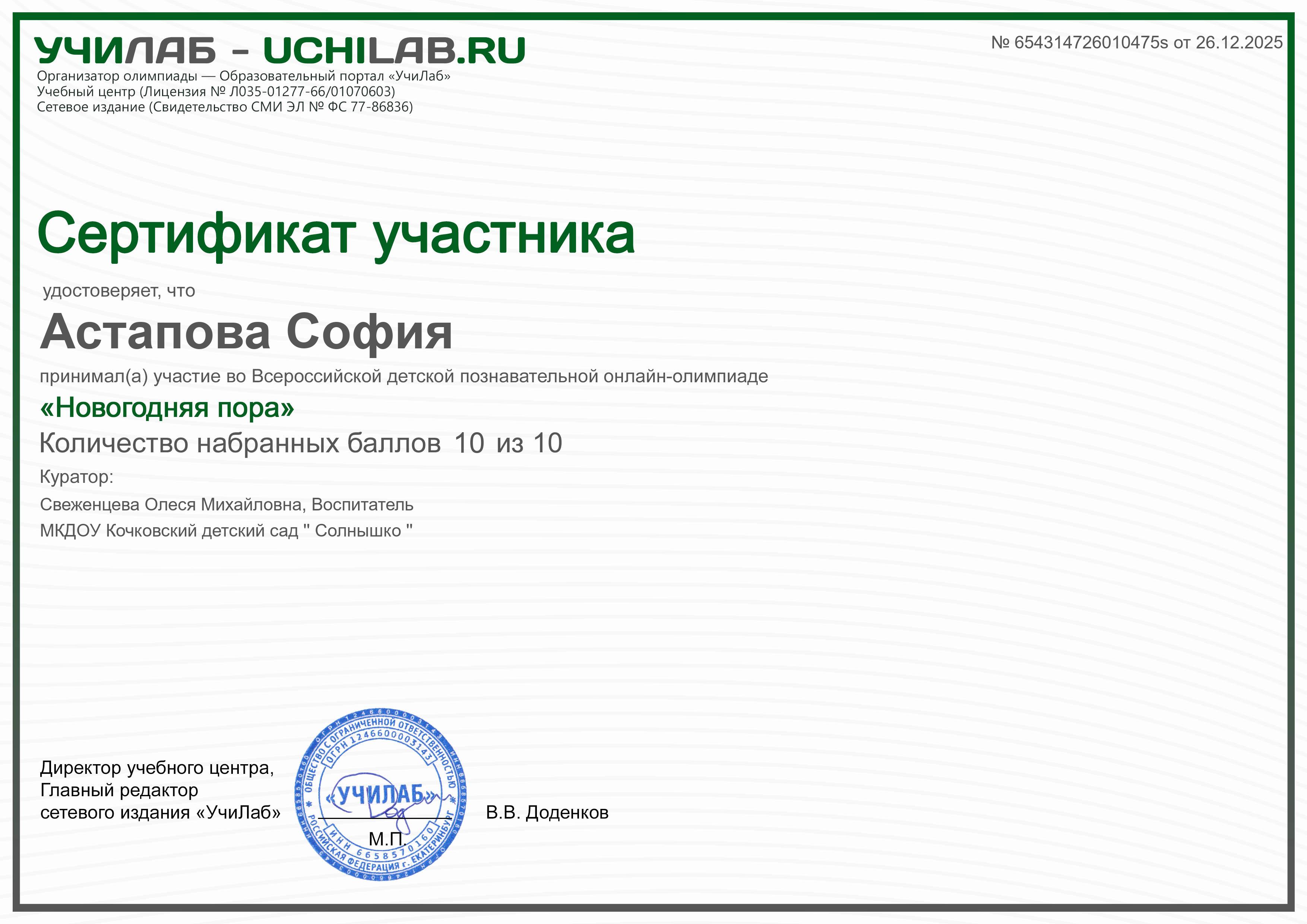 Всероссийская онлайн-олимпиада "Новогодняя пора" Астапова София